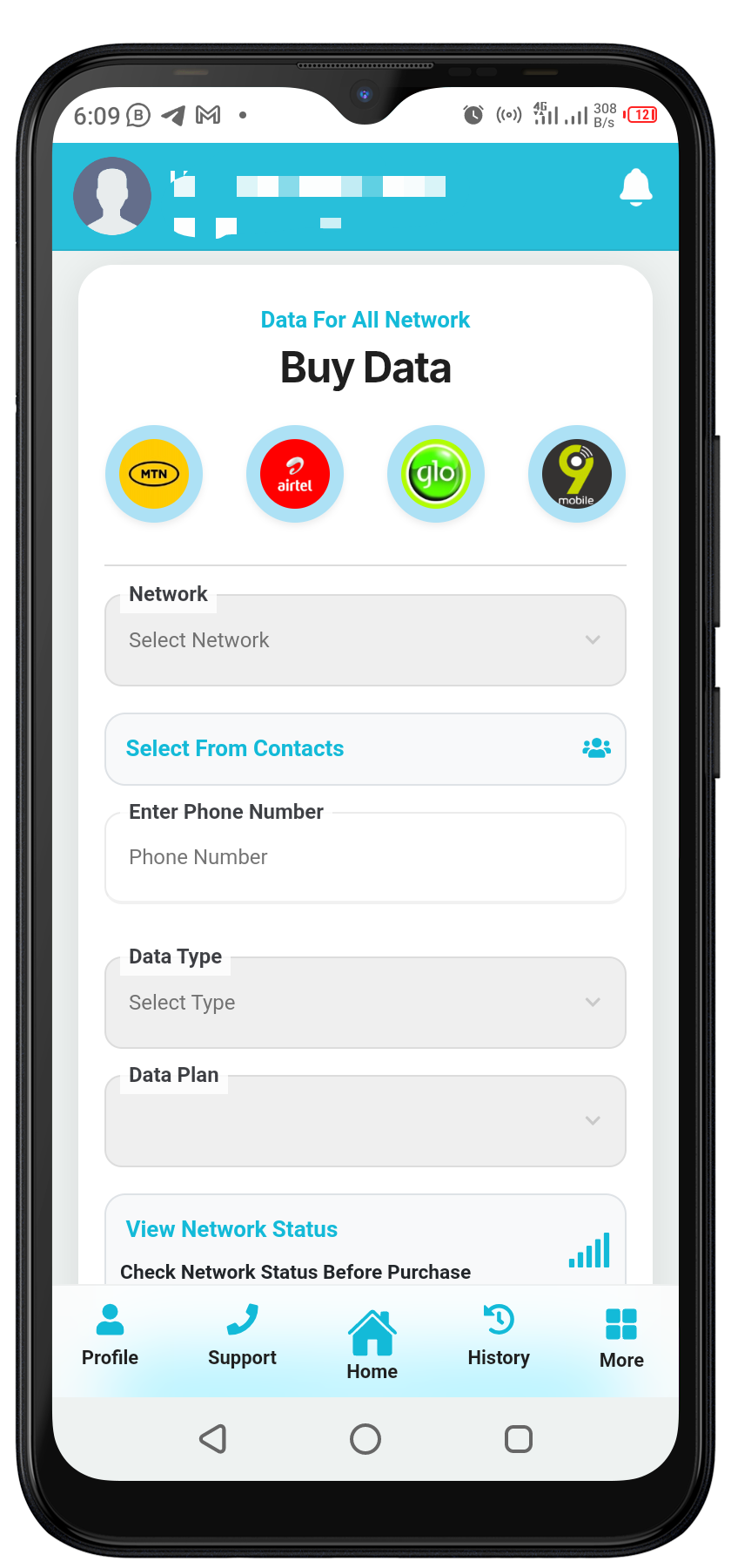 Select network, select data plan, enter phone number, and provide a transaction pin to complete the transaction.